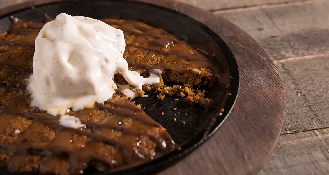 Dire Wolf Imperial Stout läggs till en klassisk kolasås medan den värms upp och ger såsen en rostad chokladsmak. Den såsen toppar sedan den konjak-indränkta briochen tillsammans med en äggnötsglass konjakkörsbärssylt och kanelvalnötssmula.