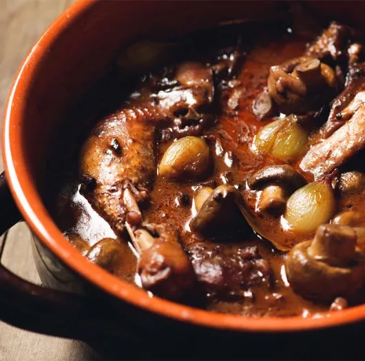 Coq au vin är en utsökt traditionell fransk maträtt som består av bräserad kycklinglardonsvamp och typiskt jordnära röd Bourgogne. Över hela Frankrike finns det många varianter av detta recept beroende på vilket vin som görs i regionen. I Alsace används skarpt vitt vin; i söder ett apelsinvin eller rosé. För vår unika amerikanska hantverksölsmetod har detta recept anpassats för att få fram höstnoterna av en brown ale. Detta recept kan göras rikare genom att byta till en dubbel också. Serverad över potatis är den här rätten ett perfekt komplement till en kall höstnatt.
